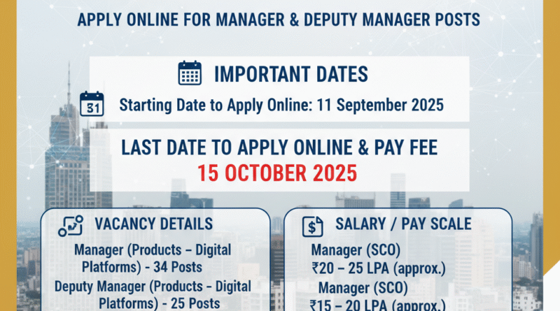 State Bank of India (SBI) has released the official notification (Advertisement No. CRPD/SCO/2025-26/10) for the recruitment of Specialist Cadre Officers (SCO) on a regular basis. Eligible Indian citizens can apply online for the posts of Manager (Products – Digital Platforms) and Deputy Manager (Products – Digital Platforms).